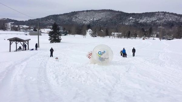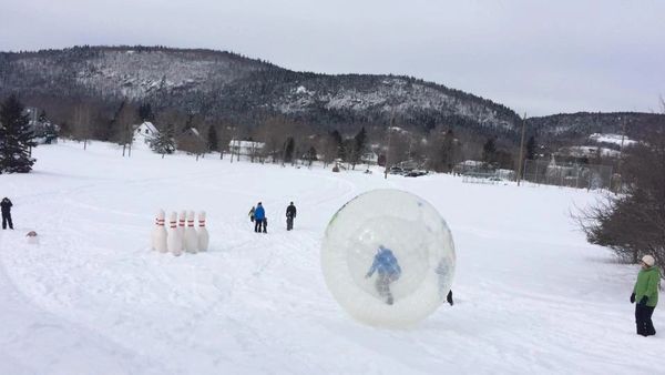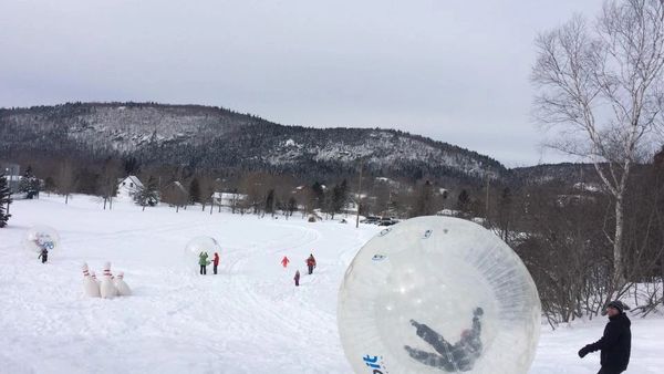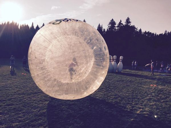 Snow or land zorbing allows the participant to roll and run (or tumble) down a hill while encased in a giant inflated bubble. The zorb will roll down the hill while the individual runs along in the ball (like a hamster) with the goal of knocking down a giant set of inflatable bowling pins at the bottom of the hill. We a