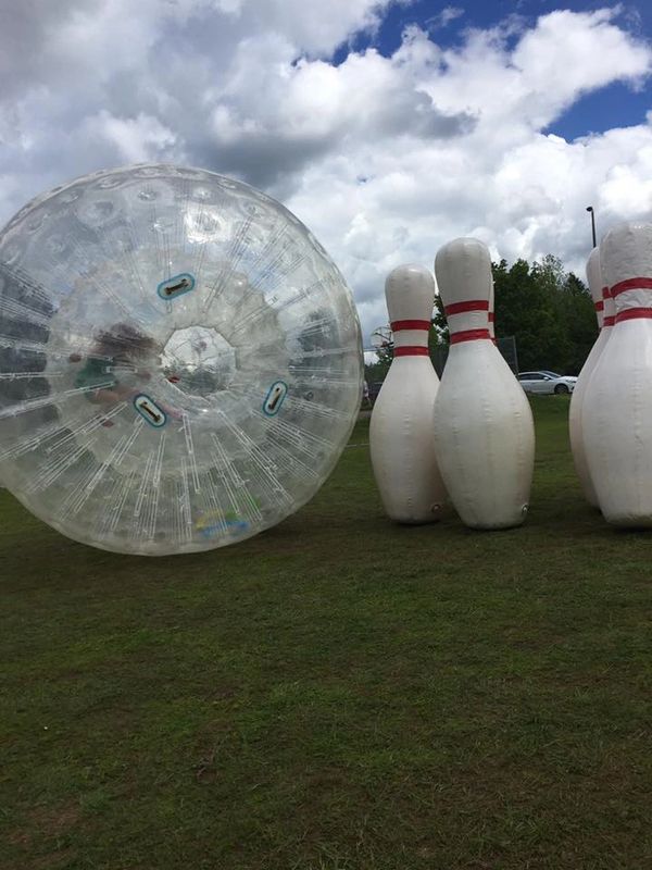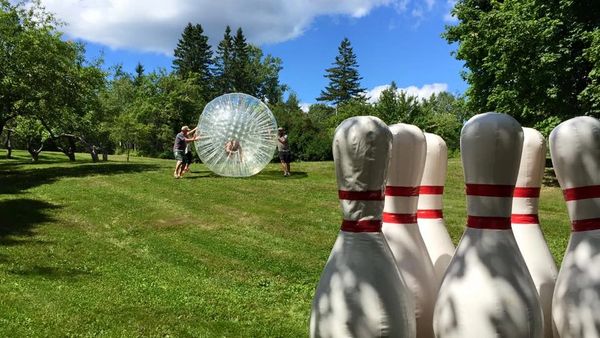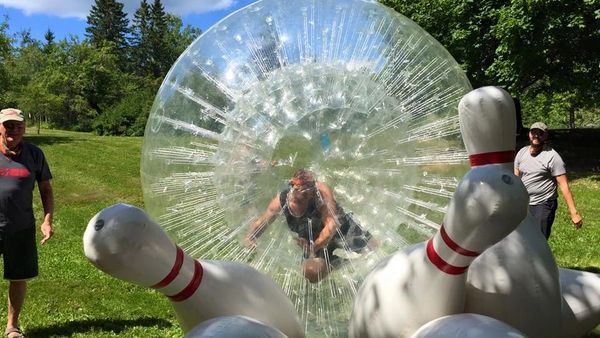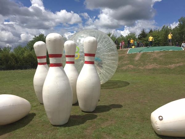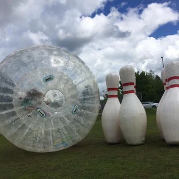 Zorbing can also be done on very flat ground. Participants can have races in the zorbs from Point A to Point B or to see who can reach and knock down the giant inflatable bowling pins first.